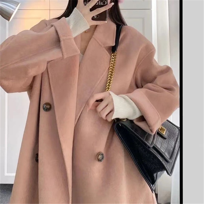 燕麦色双面羊绒大衣女2024年韩版中长款双排扣高端羊毛呢大衣外套