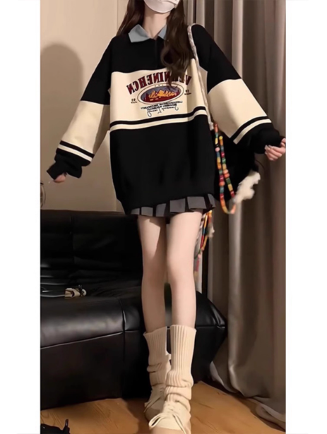美式复古polo领学生初中生卫衣女春秋新款撞色拼接假两件长袖上衣